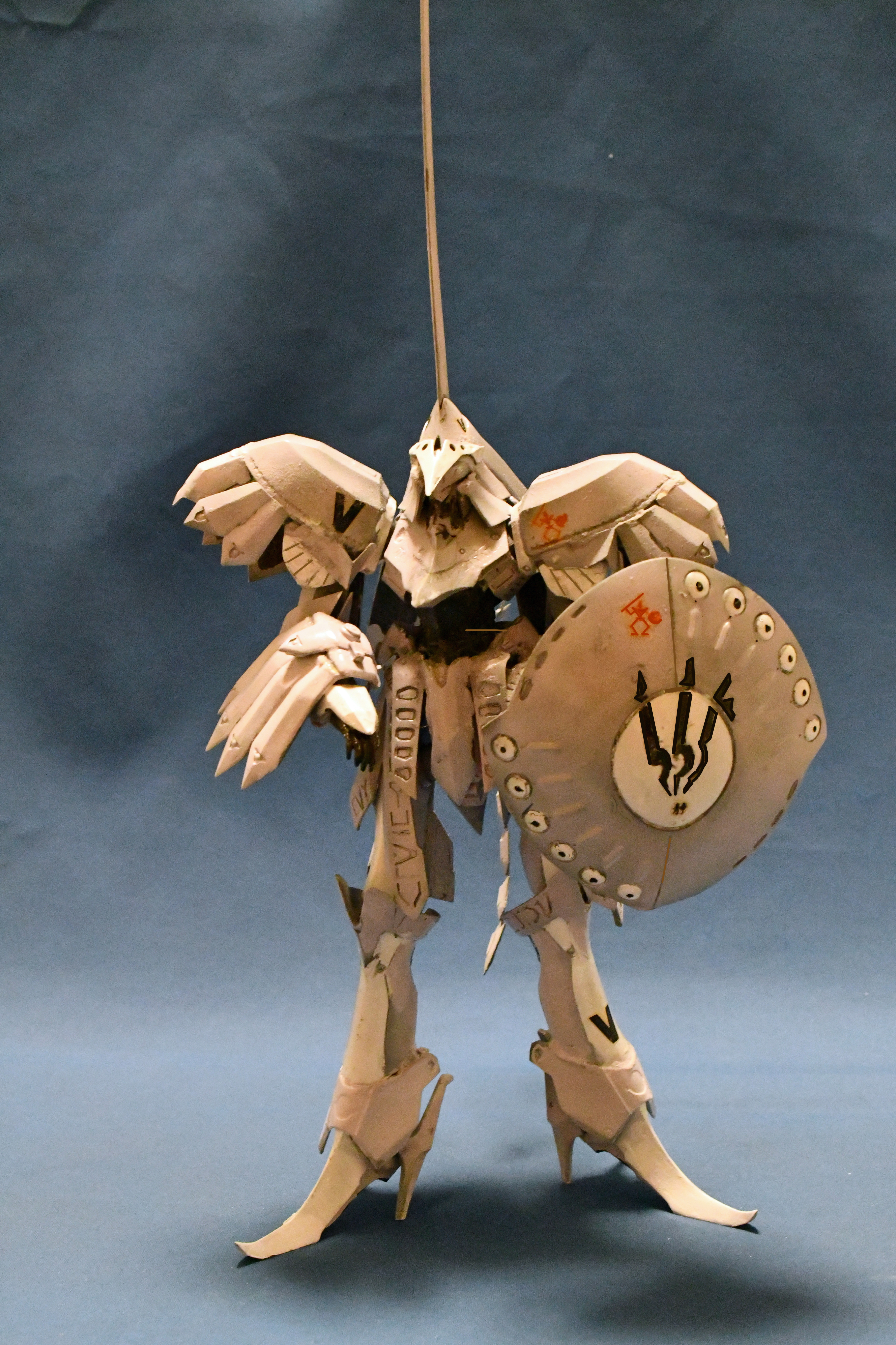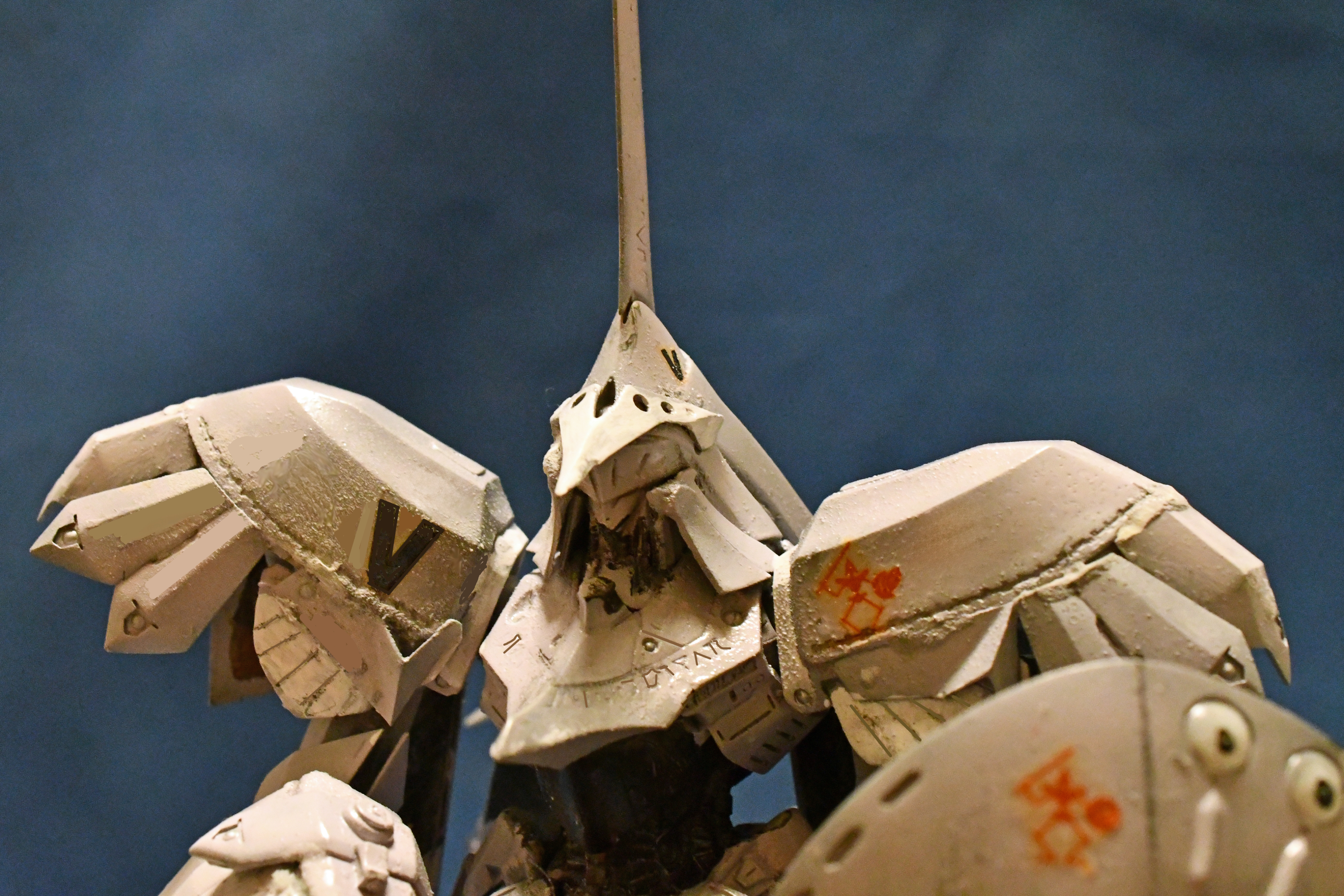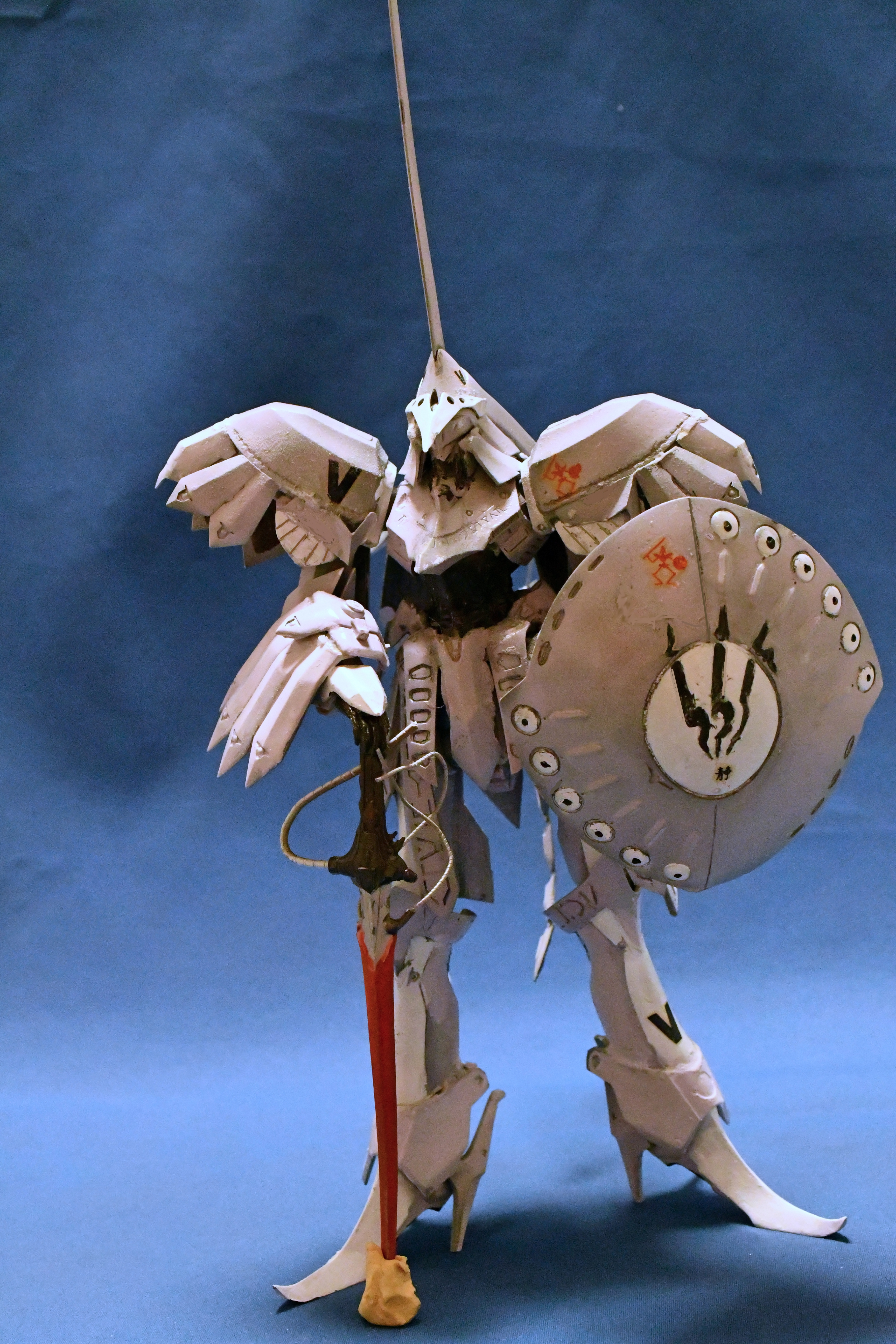 まあ、簡単に組み上がる代物でないのが分かっていたので、下地処理までしていたのですが放置。軸打ちするも微妙にずれていて右脚と左脚がズレて自立出来ない状態。レジンキットはエポキシ接着剤か瞬間接着剤使うのだけれど今回は流し込み瞬着と重曹で強度をだしました。何とか自立したものの剣の位置が上すぎて剣が接地せず、接地させるには右腕かなり修正しなければならなかったので何とか誤魔化してしまいました。